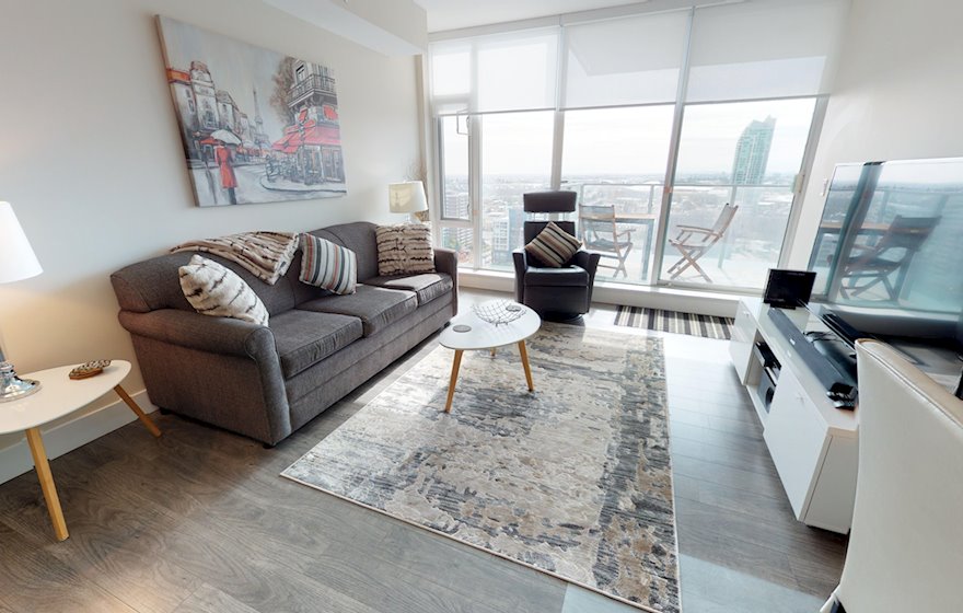 Each suite’s modern gourmet kitchen offers stainless steel appliances, gas stoves and quartz counter tops as well as a breakfast bar. The main living areas are bathed in sunlight from a full wall of floor-to-ceiling windows and are completed with elegant furnishings. Bedrooms are carpeted, and feature queen sized beds and plenty of closet space. Spend the evening on the balcony, overlooking downtown Calgary or take advantage of some of the building amenities such as the fitness centre, sauna, social room, and an outdoor rooftop terrace.