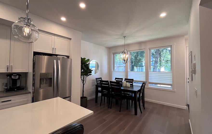 The Remington Townhouse offers a spectacular three bedroom, two-and-a-half-bathroom executive townhouse that is perfect for short-term stays by giving you the comfort needed while temporarily away from home. Located in the Renfrew neighbourhood, which is quite but central location in Calgary, the Remington Townhouse is close to amenities such as grocery, restaurants, and other services that you may require during your stay. A spacious 1,400 sq ft, the Remington Townhouse provides modern living while in a quiet, residential area of the city. The primary bedroom features a queen bed, walk-in closet, and a 5-piece ensuite bathroom. The upstairs also includes the second bedroom which comes complete with a queen bed and 4-piece bathroom. The main floor boasts a gorgeous fully equipped kitchen with stainless steel appliances, granite counter tops, dining room, half bathroom, and living room. The living room has beautiful hardwood flooring, contemporary yet comfortable furnishings, and large windows to keep the space bright and refreshing. As an added bonus, this unit also offers a third bedroom that is currently being used as an office and could be converted into a third bedroom.