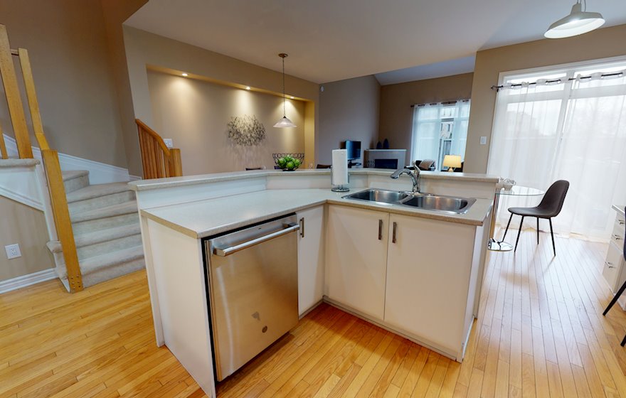 This suite is the perfect combination of space and design. The main level features, hardwood floors, stainless steel appliances, granite counters, large windows & soaring ceilings with a gas fireplace in the open concept living room. The primary bedroom has a large walk in closet with en-suite bathroom. This spacious home is close to buses, restaurants, shopping, schools and just steps from the Hi Tech Business Centre.