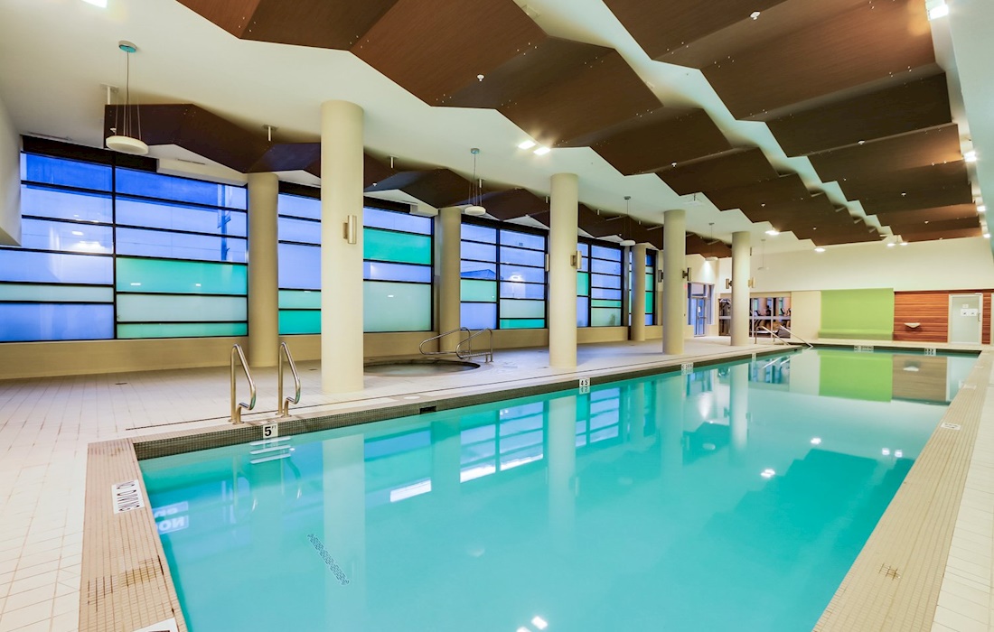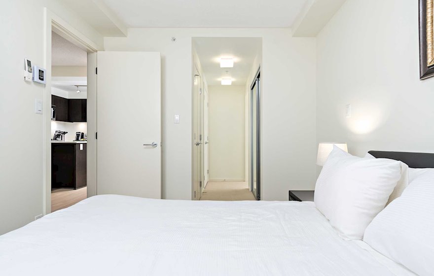 These spacious 2 bedroom, 2 bath executive suites offer sleek design paired with comfort. The fully-equipped open concept kitchens feature stainless steel appliances, quartz countertops and ample cabinet storage space. Each of the bedrooms host queen beds and quality linens, with the primary bedroom including an ensuite and walk-through closet. With floor-to-ceiling windows, light-toned hardwood flooring in the main living areas and carpeted bedrooms, these suites invite warmth and comfort throughout. The large balcony faces the inner courtyard of the complex, giving you a relaxing space to enjoy your evenings after a long day without having to listen to traffic below. Building amenities include a 75’ indoor lap pool, sauna, hot tub, social lounge, and 2 acres of landscaped rooftop and courtyard gardens.
