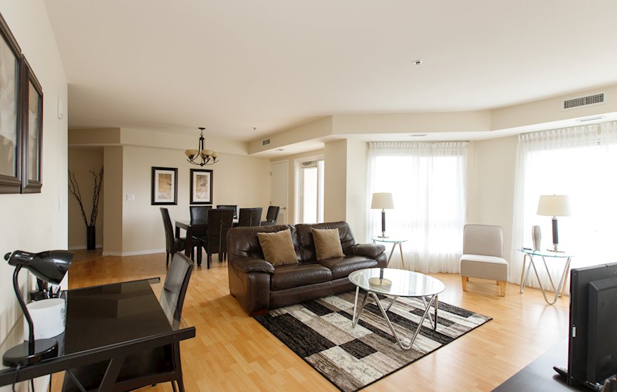 The Riverfront is a 15 storey, solid concrete building that ensures privacy in a quiet environment. It is also considered one of the best condominiums in downtown Saskatoon, offering unprecedented views of the South Saskatchewan River. Everything you need is right outside your doorstep. First class shopping is just minutes away including the city's best cafes and hot spots. The Riverfront offers one and two bedroom, fully furnished apartment suites. Each executive suite is tastefully decorated and the living room boasts contemporary furnishings. The kitchen is fully equipped and comes with five appliances, including an in-suite laundry facility. Enjoy having a private balcony. The on-site fitness facility provides you with the opportunity to work out before or after a long day.