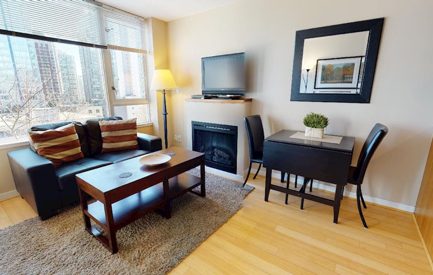 This open-concept one bedroom suite features a fully-equipped kitchen with stainless steel appliances and granite countertops. With spectacular views of the city, the suite features a separate office space for those needing a quiet place to work, a gas fireplace in the living room, and private balcony accessible through the living room. Building amenities include exercise centre, landscaped garden, meeting room and social lounge. When away on an extended stay, why be in a hotel when you can stay in an entire suite?